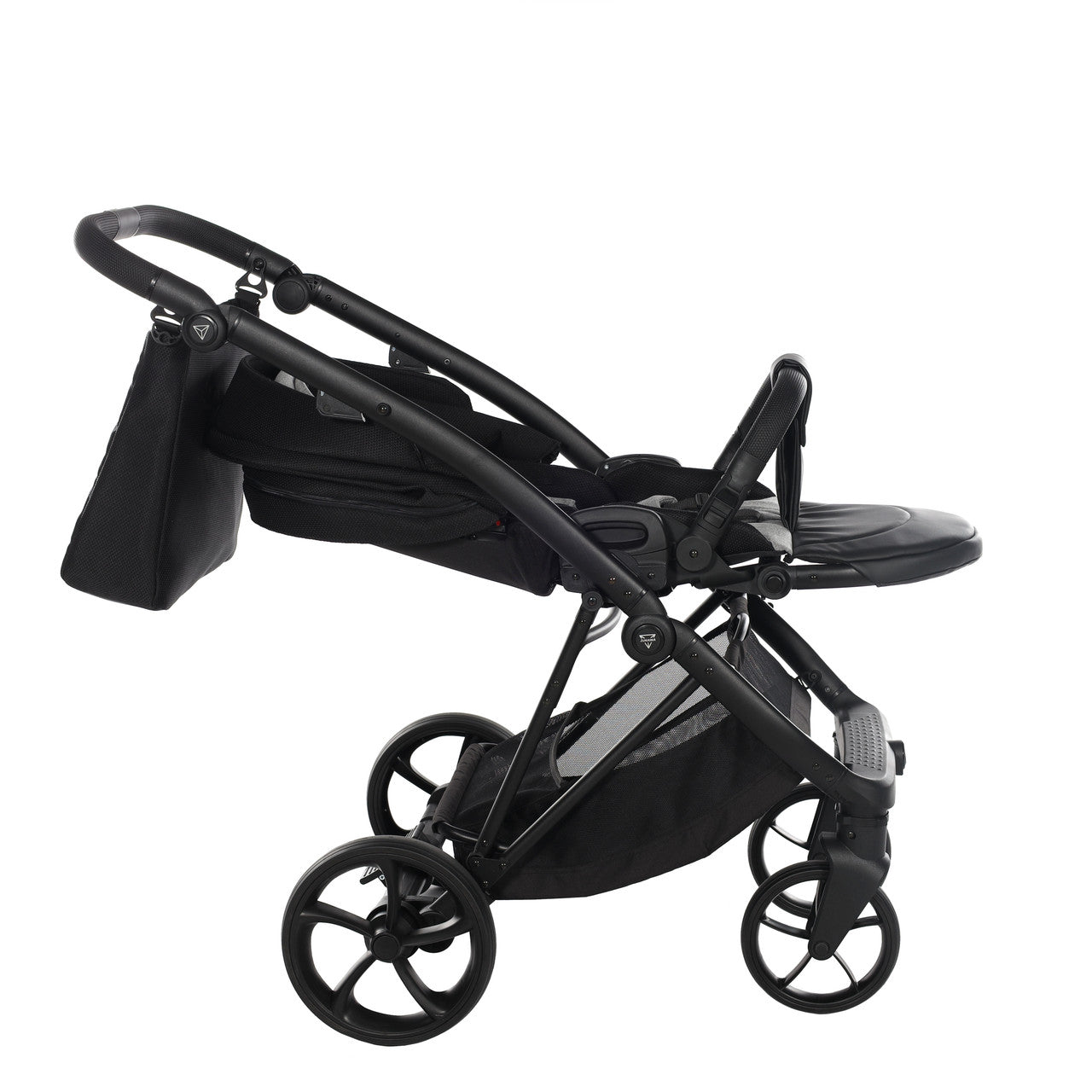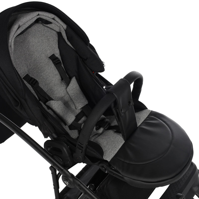 The height adjustable handle bar can be adjusted 180° to suit all members of the family and has an eco-leather finish for utmost comfort. The ingenious folding mechanism allows for a compact collapse, the chassis can fold together with the pushchair seat unit attached, protecting the upholstery and ensuring hygiene.