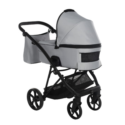 The aluminium chassis comes with superb suspension, large shopping basket and quick release wheels. Engineered with 6 shock breakers which make the pram extra comfortable and smooth. The reliable front suspension release system absorbs shocks from the ground and frontal blows, for example when hitting the curb. The chassis is engineered with a separate adjustable shock absorber, ensuring agile steering on all terrains.
