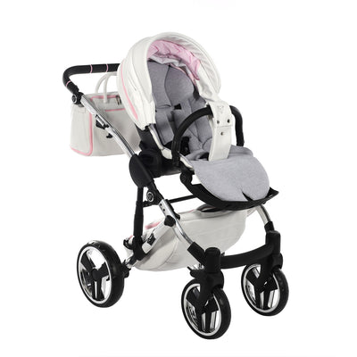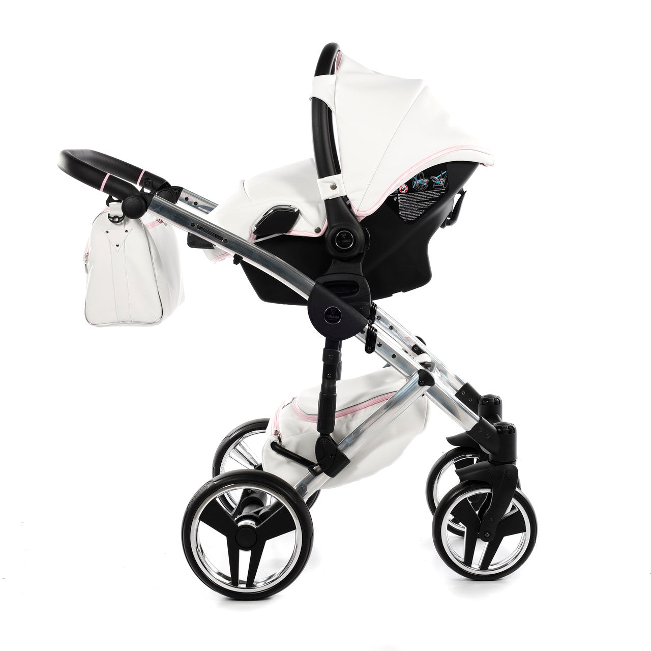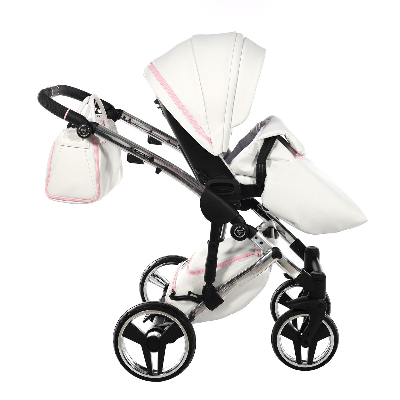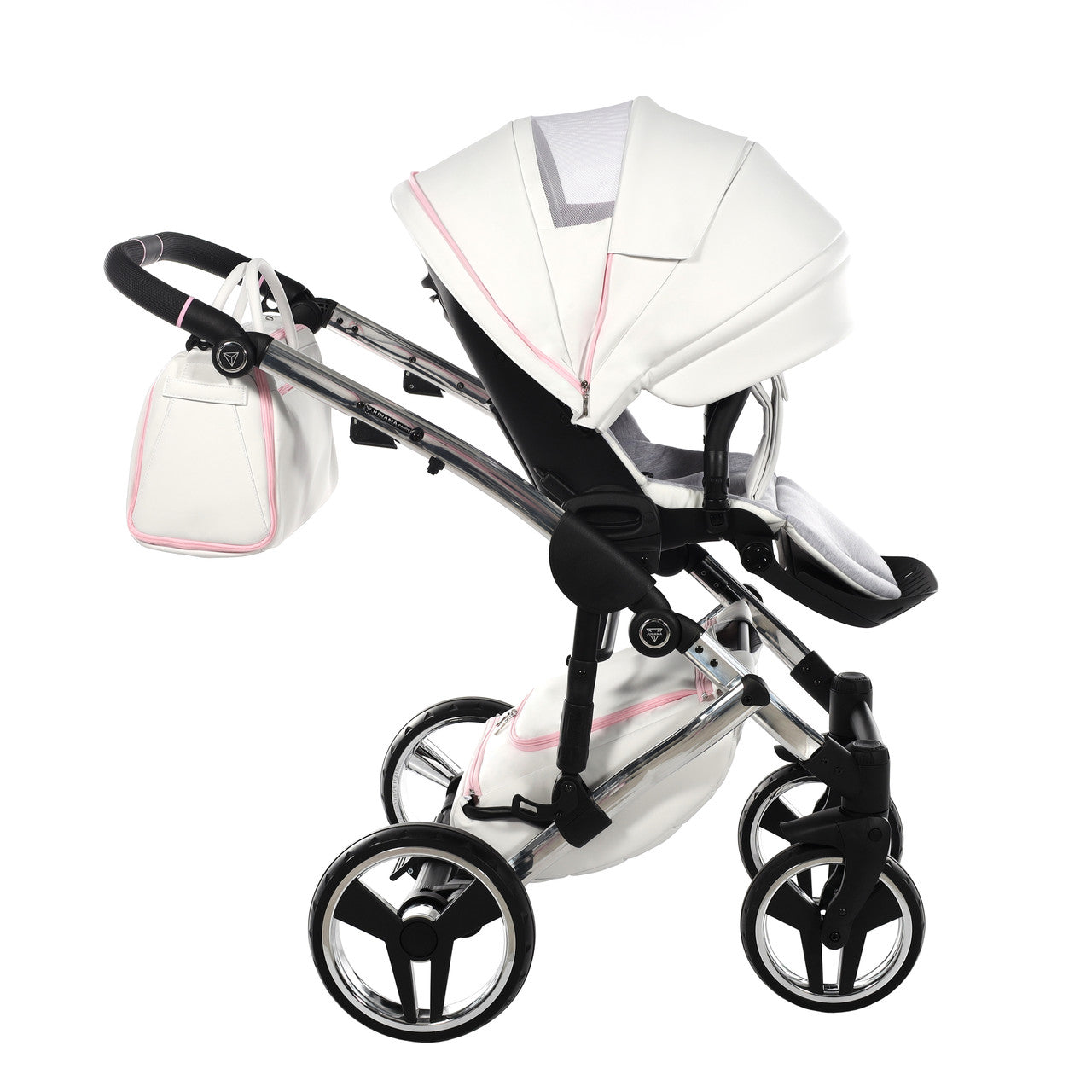The Junama Candy pram is one of our bestsellers and comes in both blue and pink. The Candy Pink pram is a gorgeous pram with the iconic diamond design carrycot in candy pink, white eco-leather hood, silver frame, silver wheel rims and candy pink detailing.