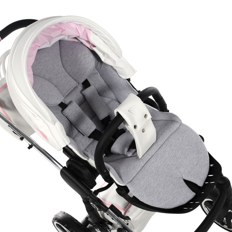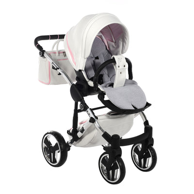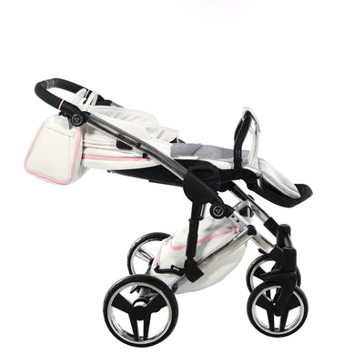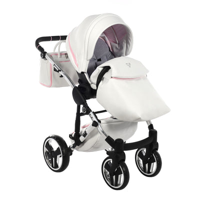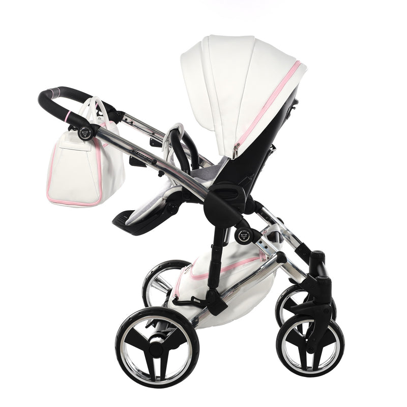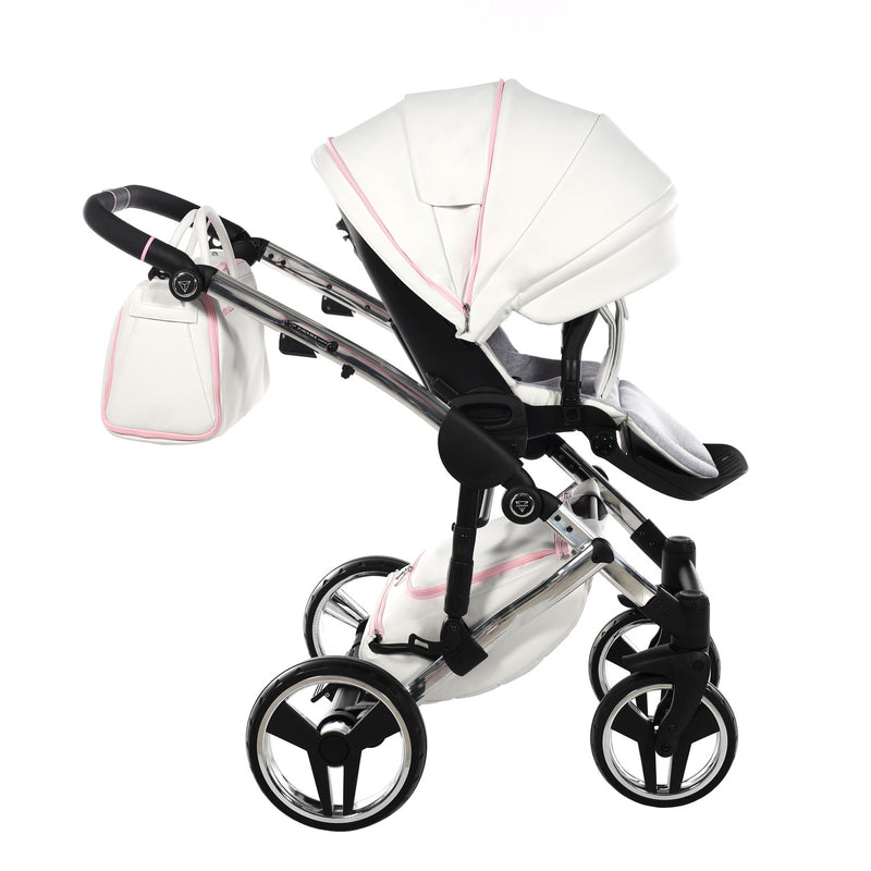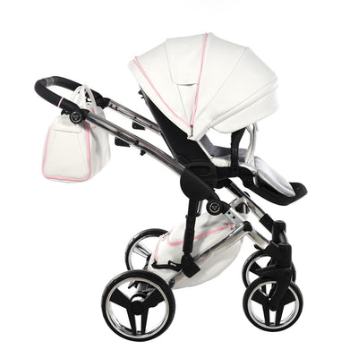The Junama Candy pram is one of our bestsellers and comes in both blue and pink. The Candy Pink pram is a gorgeous pram with the iconic diamond design carrycot in candy pink, white eco-leather hood, silver frame, silver wheel rims and candy pink detailing.
