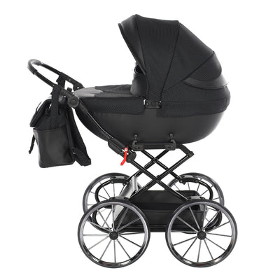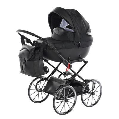 The Junama dolls’ pram is a beautiful and luxurious style toy pram for children. The doll’s prams really are a mini version of the full size Junama pram. Just like the Junama adult pram, the mini doll’s pram has high quality finishes and functionalities. The eco-leather hood folds down and even has a ventilation panel.