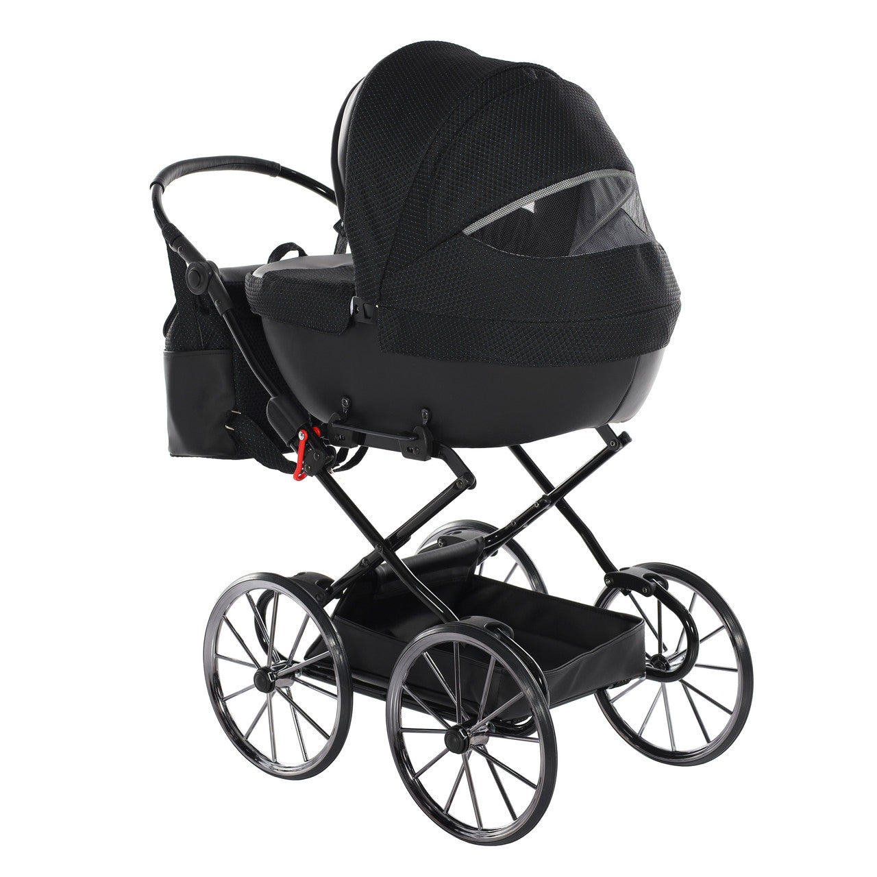 The chassis has sprung suspension and an adjustable-height handle, for super-comfortable pushing. The carrycot comes off, the chassis folds and the wheels can be removed for storage. The pram comes with a matching mini changing bag which can be attached to the chassis. There is a storage basket underneath for extra storage. A beautiful doll's pram your family can pass down for generations