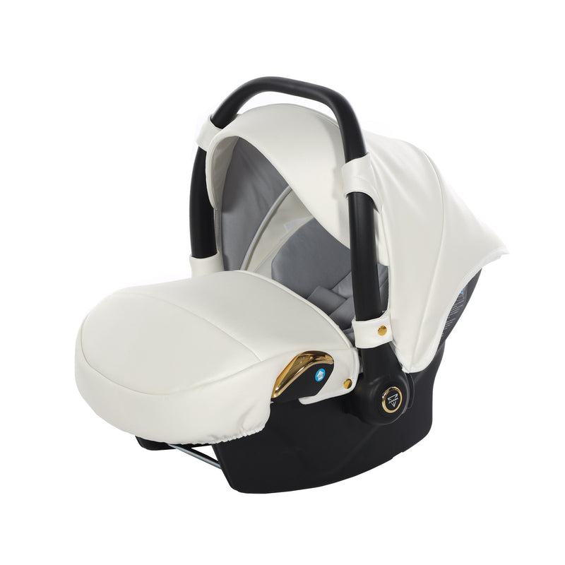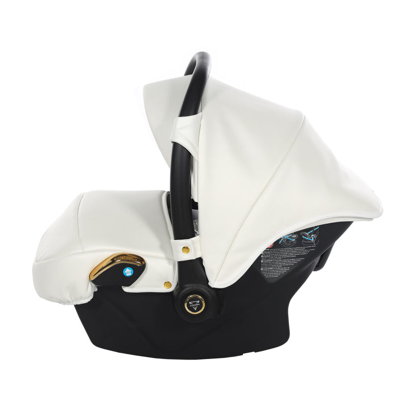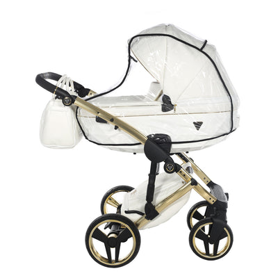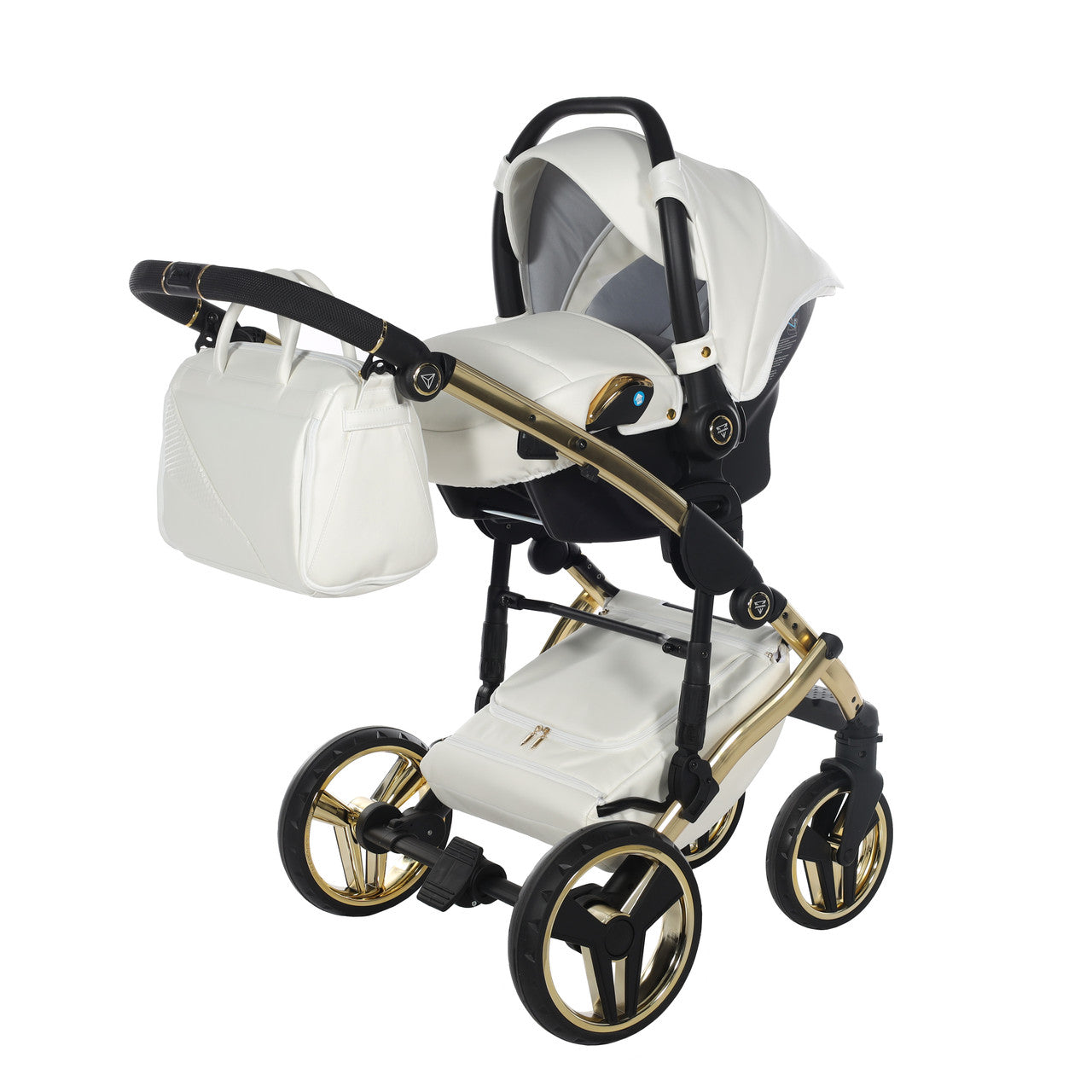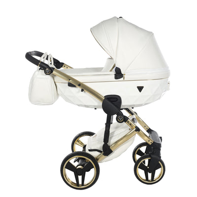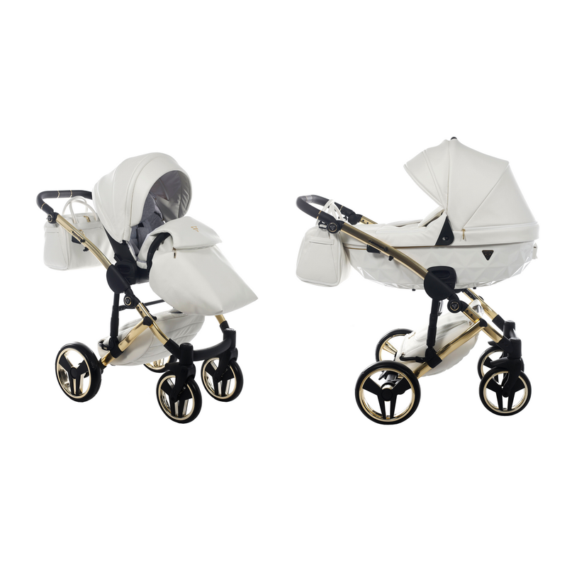 The Junama Individual white gold pram is stunning, with a white iconic diamond design carrycot, gold frame, gold wheel rims, gold detailing and finished with a high quality eco-leather hood which is very easy to clean. The Junama Individual collection comes in 6 different colours.