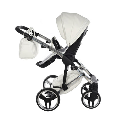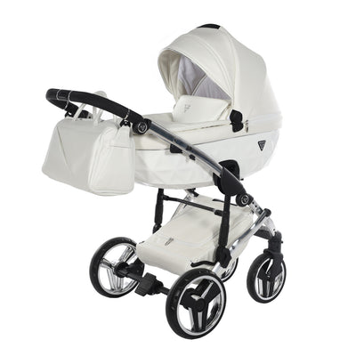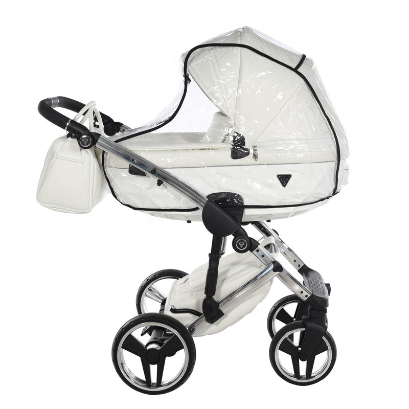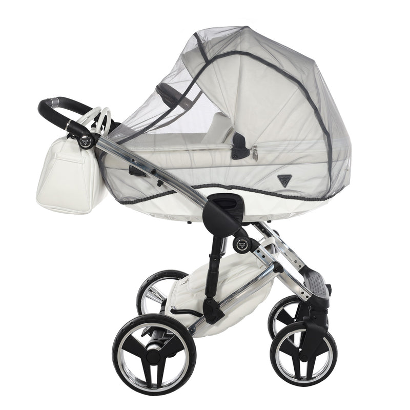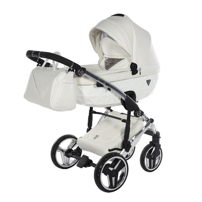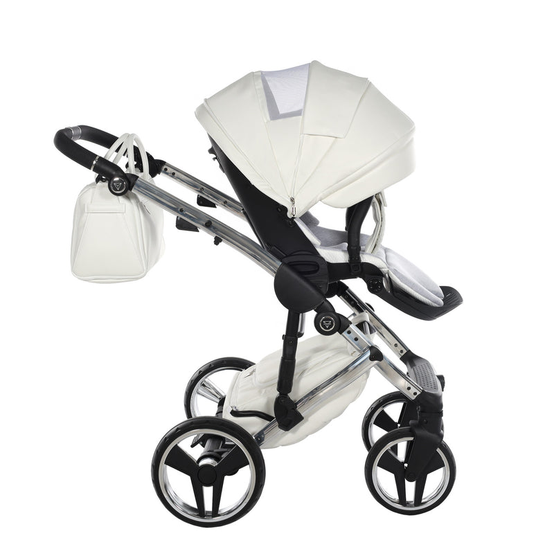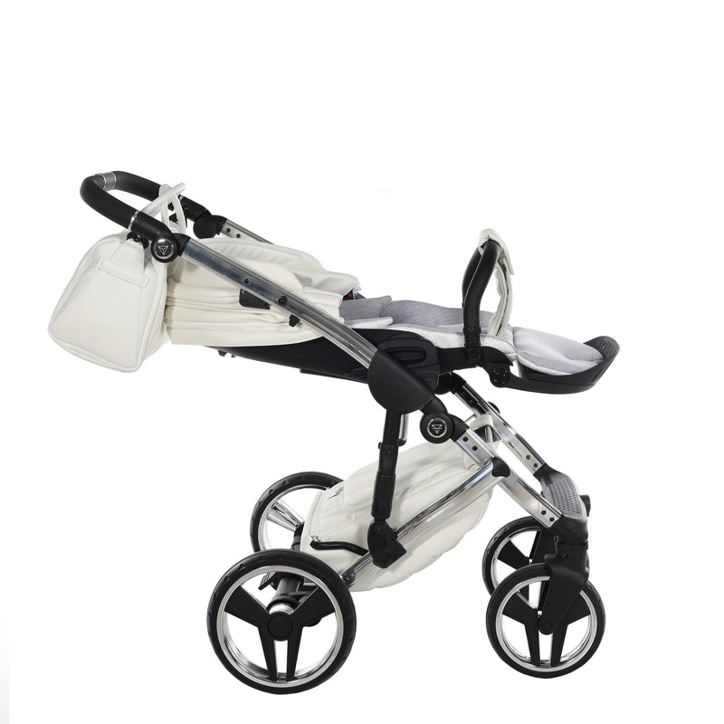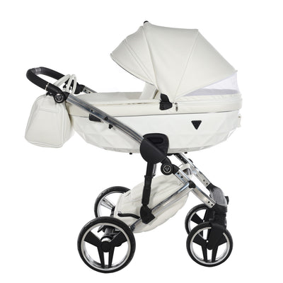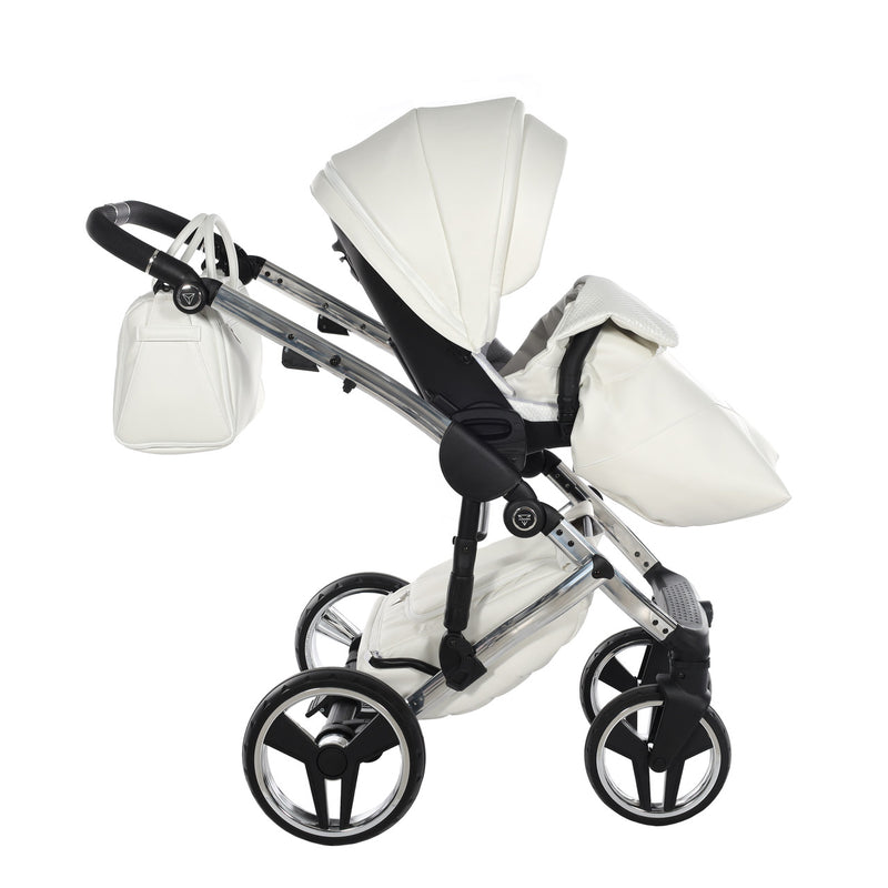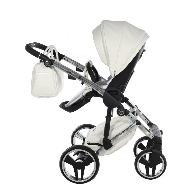 The Junama Individual white silver pram is stunning, with a white iconic diamond design carrycot, silver frame, silver wheel rims, silver detailing and finished with a high quality eco-leather hood which is very easy to clean. The Junama Individual collection comes in 6 different colours.