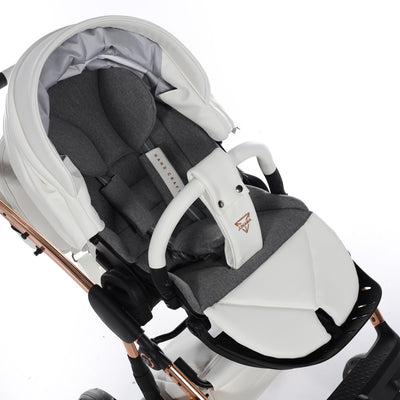 The height adjustable handle bar can be adjusted 180° to suit all members of the family and has an eco-leather finish for utmost comfort. The ingenious folding mechanism allows for a compact collapse, the chassis can fold together with the pushchair seat unit attached, protecting the upholstery and ensuring hygiene.