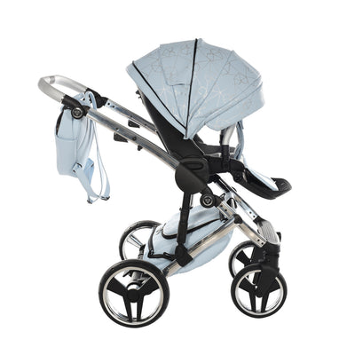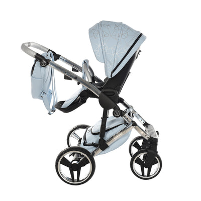 The aluminium chassis comes with superb suspension, large shopping basket and quick release wheels. Engineered with 6 shock breakers which make the pram extra comfortable and smooth. The reliable front suspension release system absorbs shocks from the ground and frontal blows, for example when hitting the curb. The chassis is engineered with a separate adjustable shock absorber ensuring agile steering on all terrains.