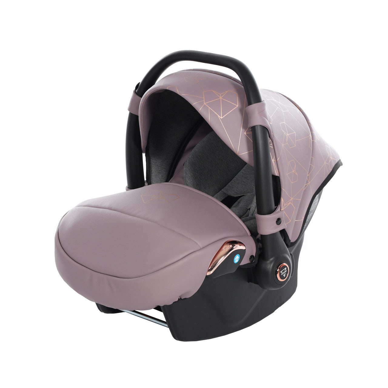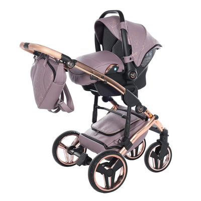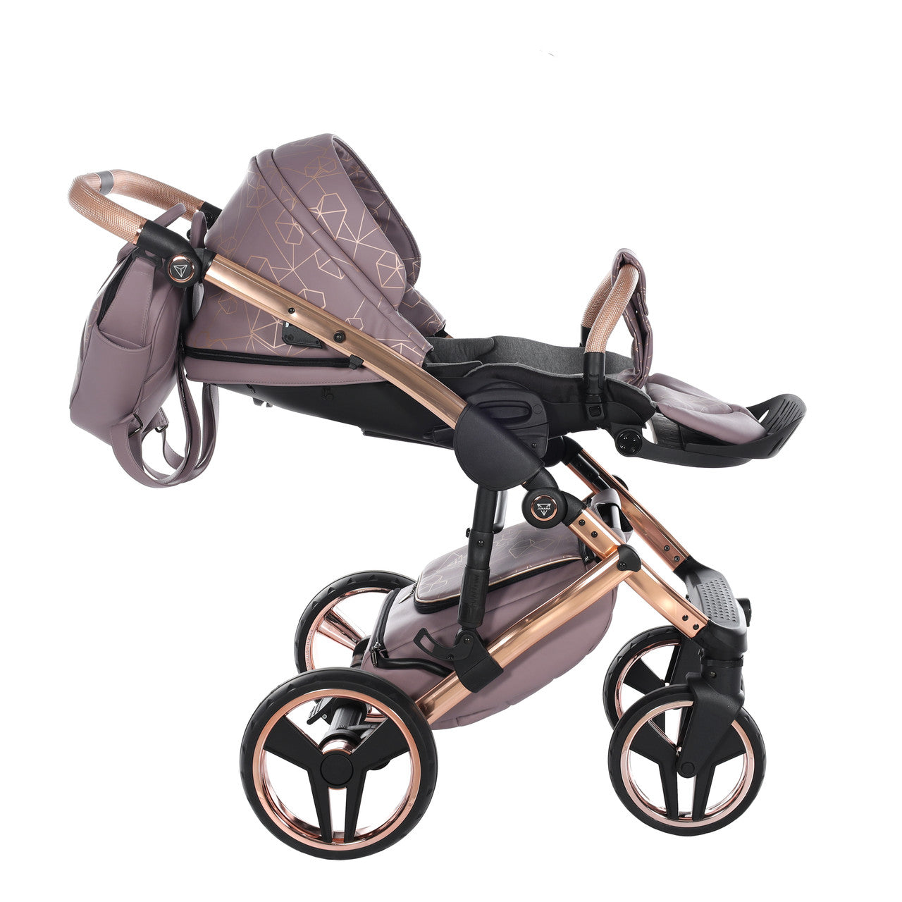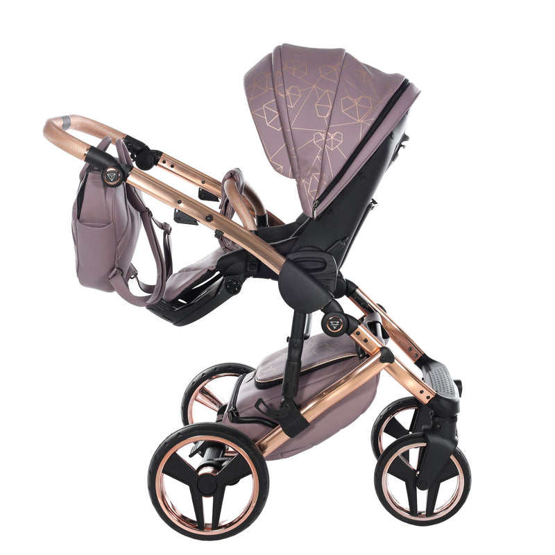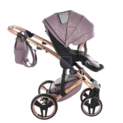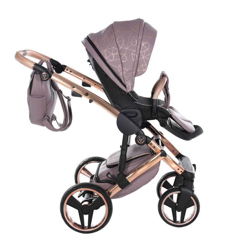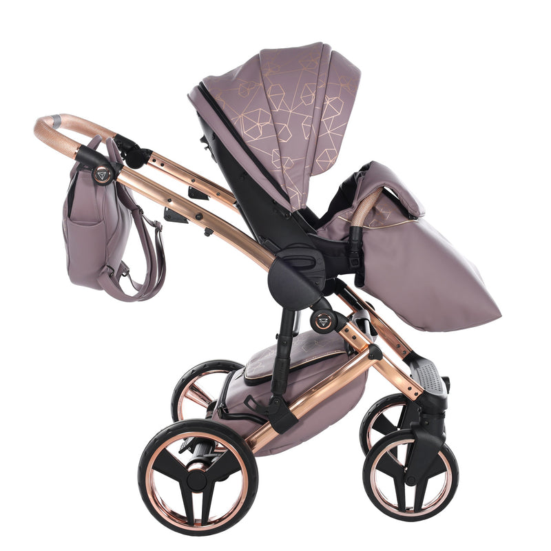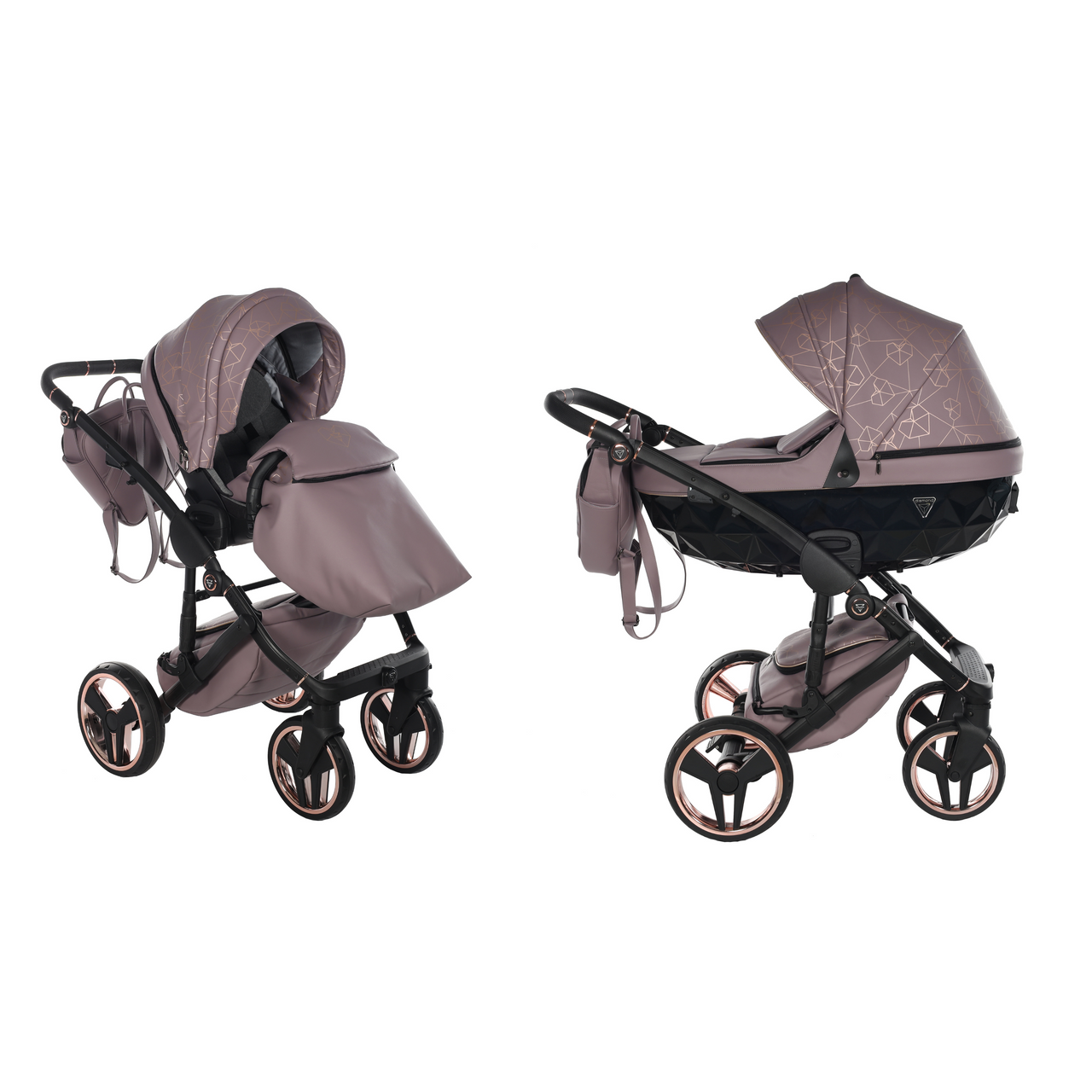 The Junama Heart pram is a gorgeous pram with a black iconic diamond design carrycot, matt black frame, rose gold rims and rose gold detailing. The pram is finished with a high quality mauve and rose gold heart printed eco-leather hood.