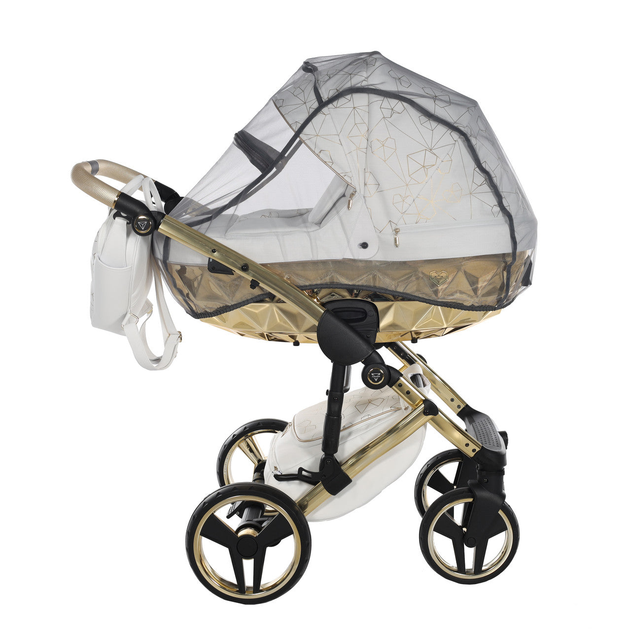 The Junama Heart pram is a gorgeous white pram with the iconic diamond design carrycot in gold mirror, white frame, white rims, gold handle bar and gold detailing. The pram is finished with a high quality white and gold heart print eco-leather hood.