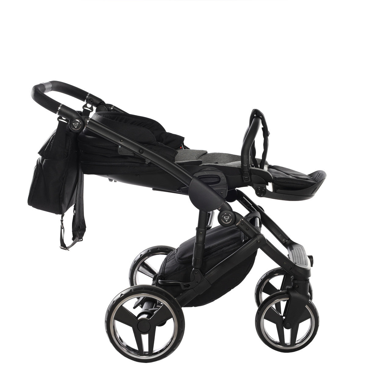 The aluminium chassis comes with superb suspension, large shopping basket and quick release wheels. Engineered with 6 shock breakers which make the pram extra comfortable and smooth. The reliable front suspension release system absorbs shocks from the ground and frontal blows, for example when hitting the curb. The chassis is engineered with a separate adjustable shock absorber, ensuring agile steering on all terrains.