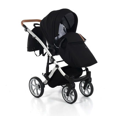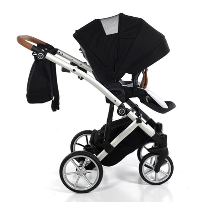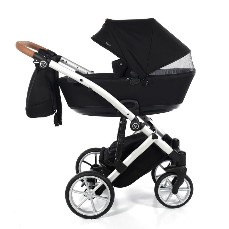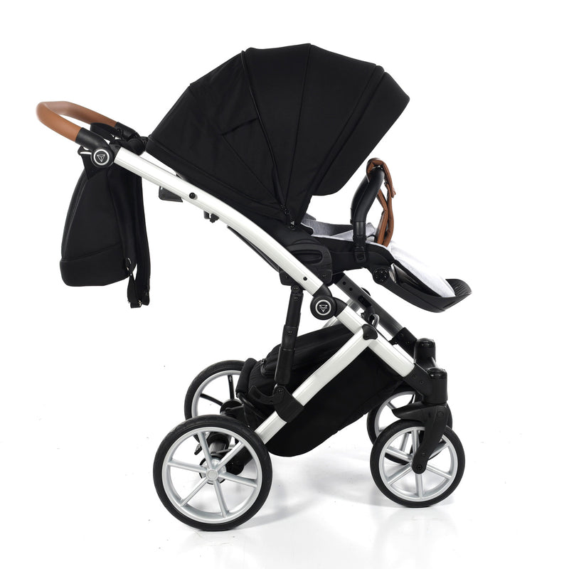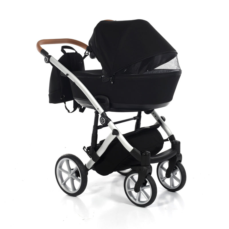 The aluminium chassis comes with superb suspension, large shopping basket and quick release wheels. Engineered with 6 shock breakers which make the pram extra comfortable and smooth. The reliable front suspension release system absorbs shocks from the ground and frontal blows, for example when hitting the curb. The chassis is engineered with a separate adjustable shock absorber ensuring agile steering on all terrains.