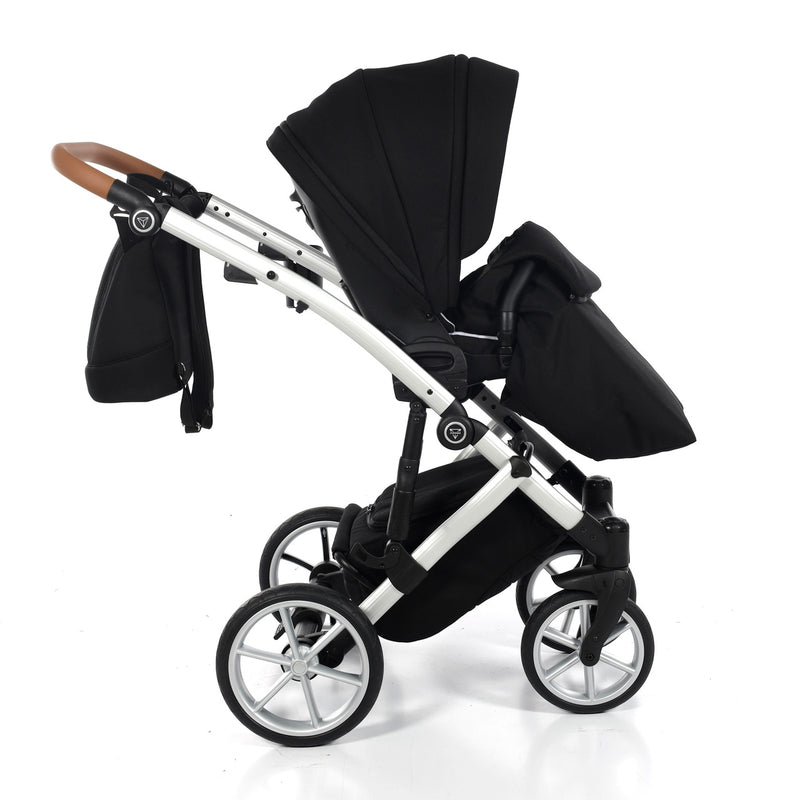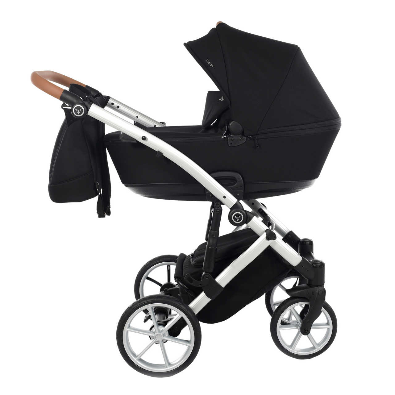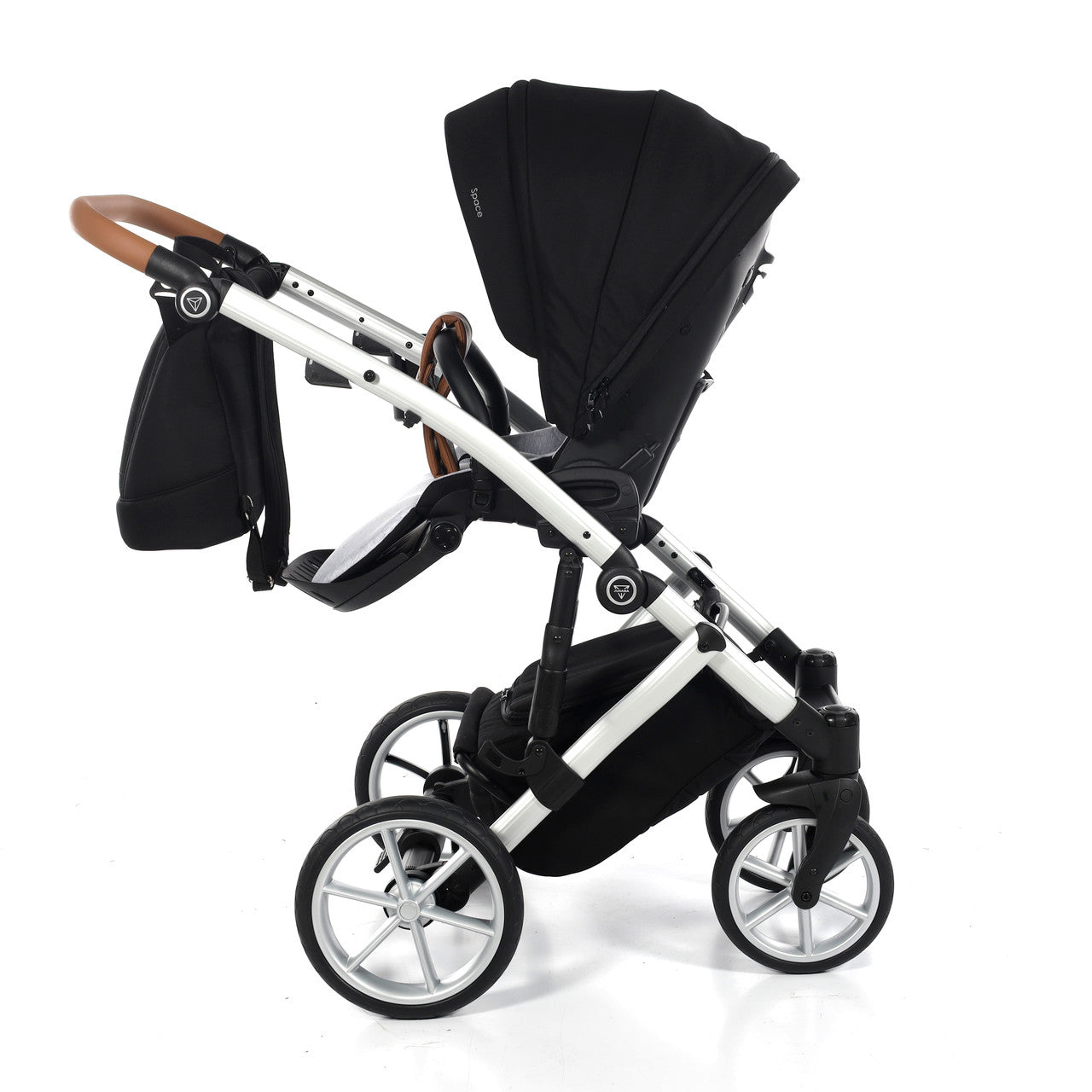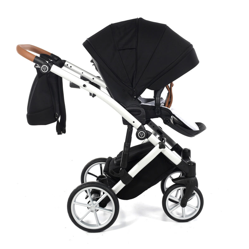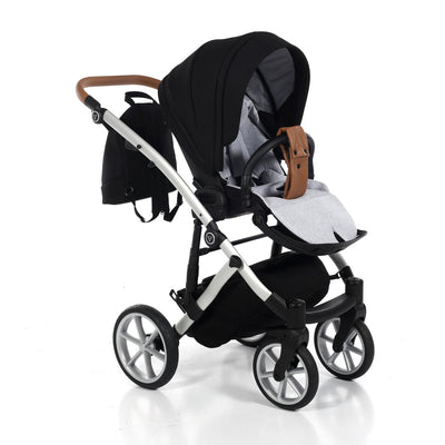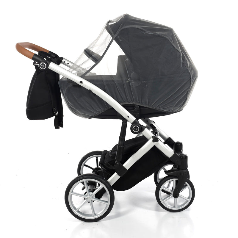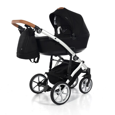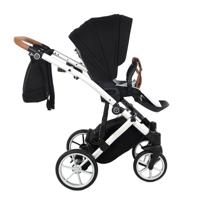 The aluminium chassis comes with superb suspension, large shopping basket and quick release wheels. Engineered with 6 shock breakers which make the pram extra comfortable and smooth. The reliable front suspension release system absorbs shocks from the ground and frontal blows, for example when hitting the curb. The chassis is engineered with a separate adjustable shock absorber ensuring agile steering on all terrains.