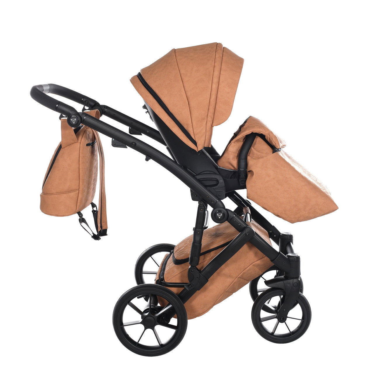 The height adjustable handle bar can be adjusted 180° to suit all members of the family and has an eco-leather finish for utmost comfort. The ingenious folding mechanism allows for a compact collapse, the chassis can fold together with the pushchair seat unit attached, protecting the upholstery and ensuring hygiene.