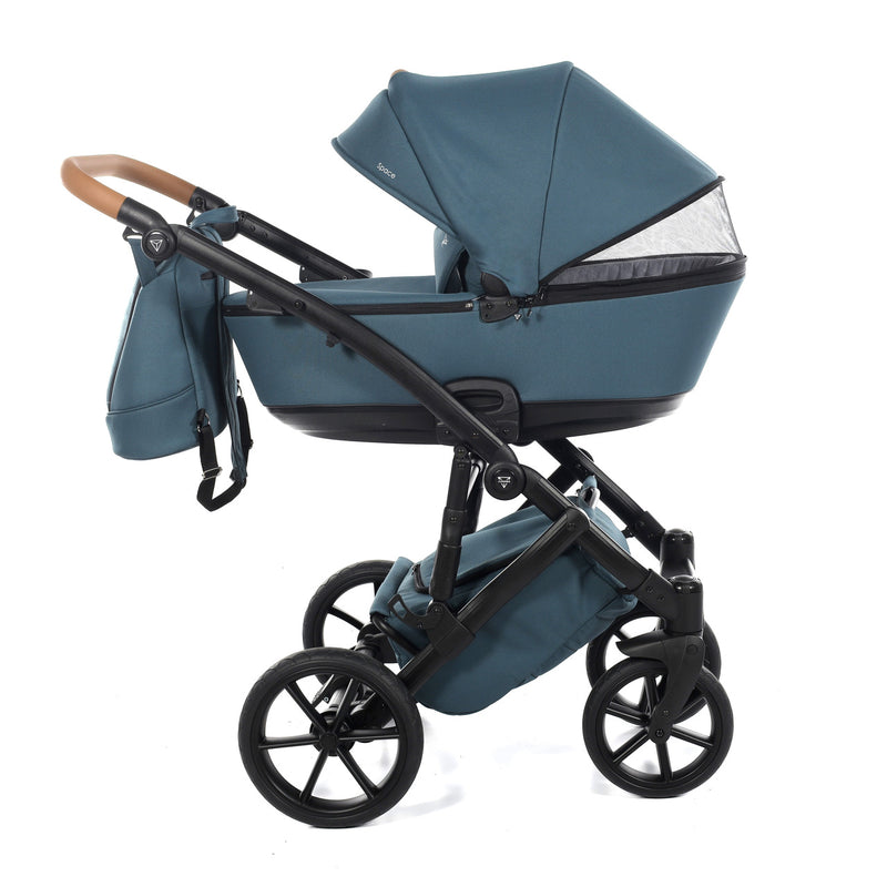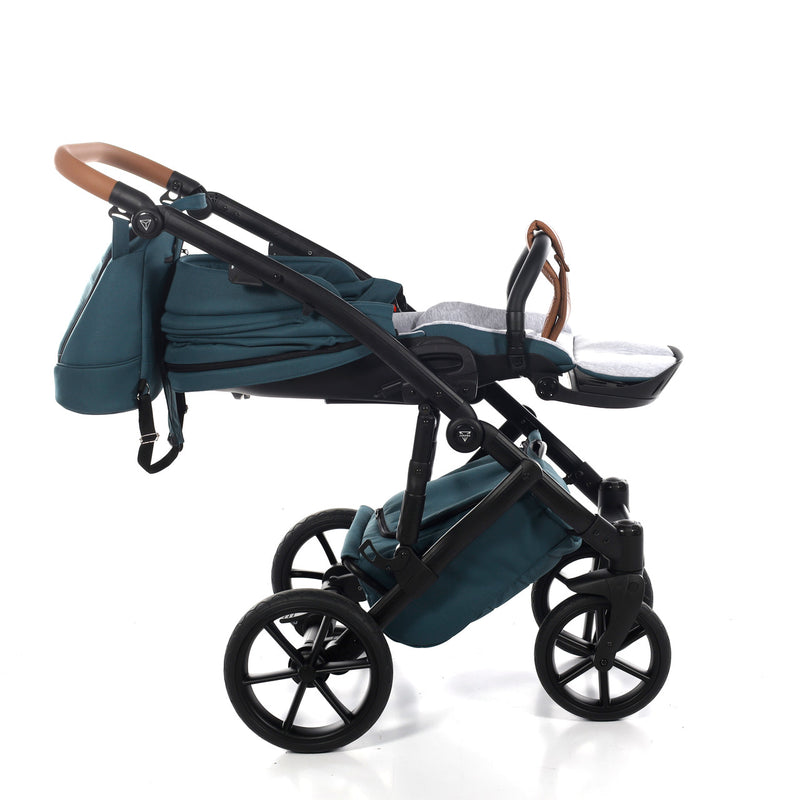 The aluminium chassis comes with superb suspension, large shopping basket and quick release wheels. Engineered with 6 shock breakers which make the pram extra comfortable and smooth. The reliable front suspension release system absorbs shocks from the ground and frontal blows, for example when hitting the curb. The chassis is engineered with a separate adjustable shock absorber, ensuring agile steering on all terrains.