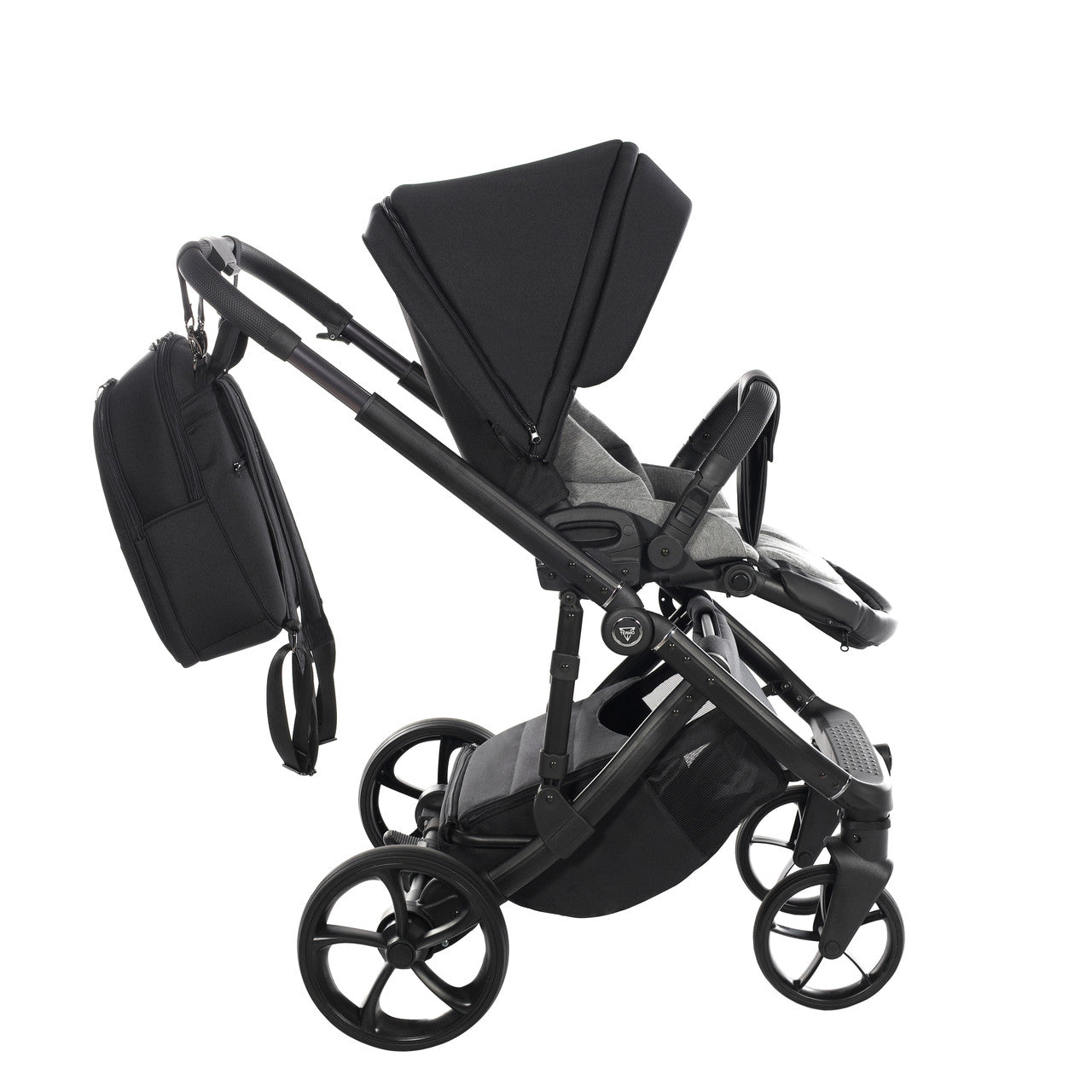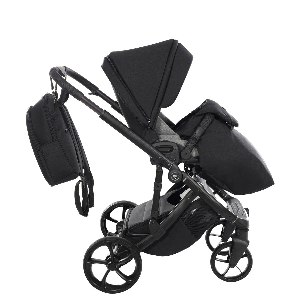 The aluminium chassis comes with superb suspension, large shopping basket and quick release wheels. Engineered with 6 shock breakers which make the pram extra comfortable and smooth. The reliable front suspension release system absorbs shocks from the ground and frontal blows, for example when hitting the curb. The chassis is engineered with a separate adjustable shock absorber, ensuring agile steering on all terrains.