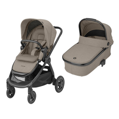 The Maxi-Cosi Adorra Luxe + Cabriofix i-Size Travel System in Twillic Truffle is a special edition stroller that comes as part of a complete travel package, including a Luxe car seat, carrycot and footmuff, all in matching premium fabrics and finishes.
