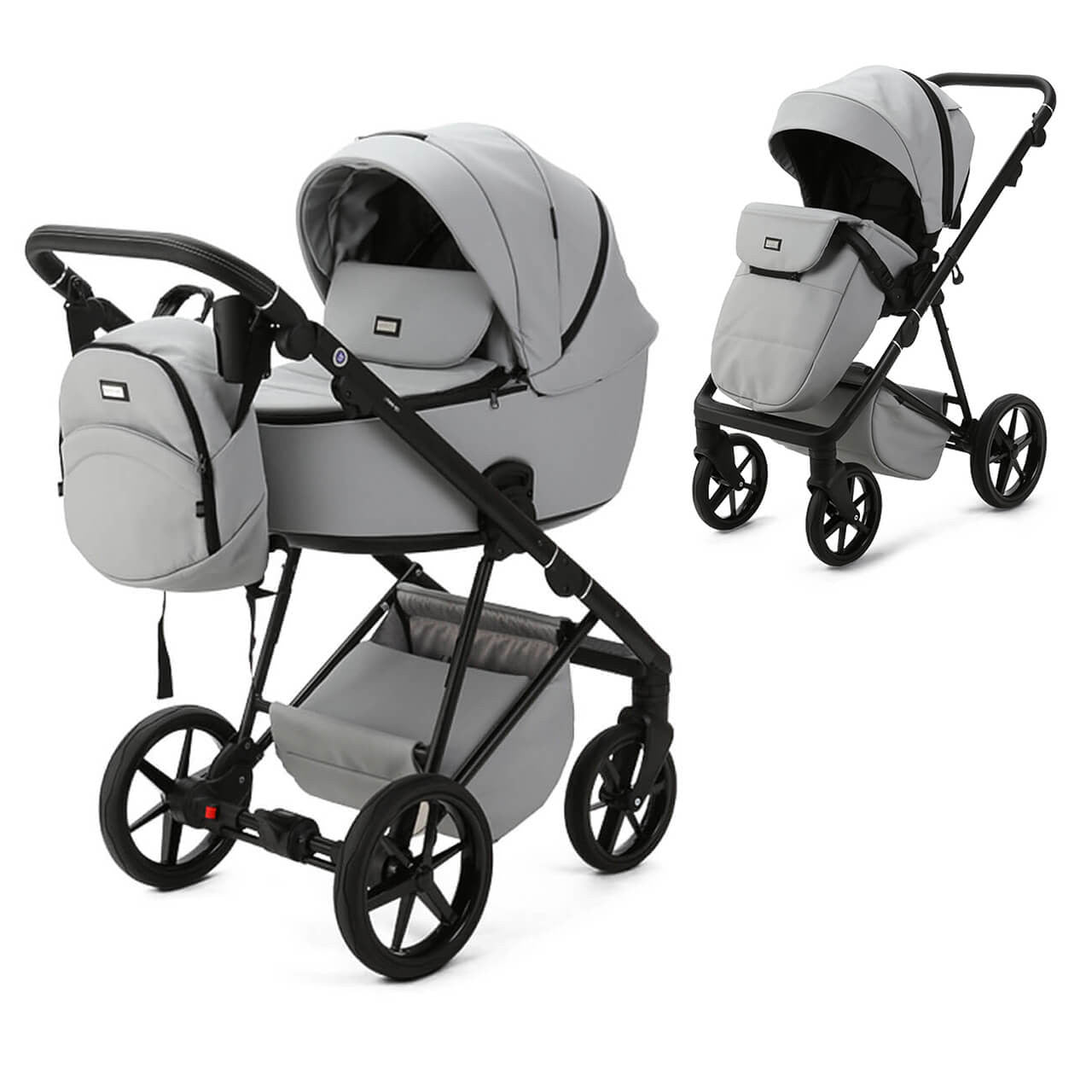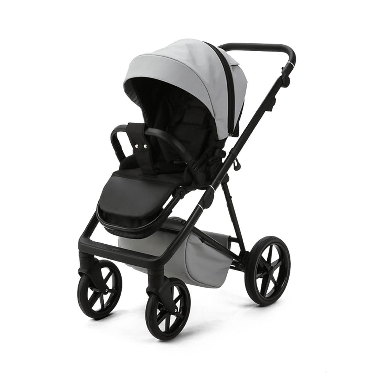The Milano Evo chassis is equipped with wheels that are resistant to punctures, featuring soft shock absorbers. It also includes an integrated parking brake and a closed shopping basket. The easy-adjustable leatherette handlebar ensures a perfect fit for any parent..