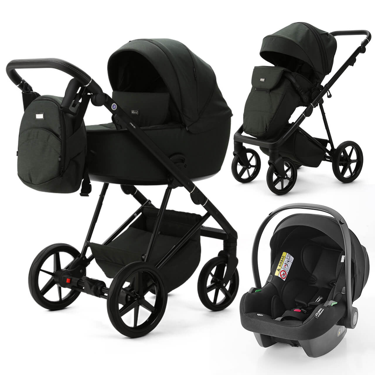 - Includes Cosmo i-Size car seat, changing bag, seat apron, cup holder, raincover, insect net and car seat adaptors