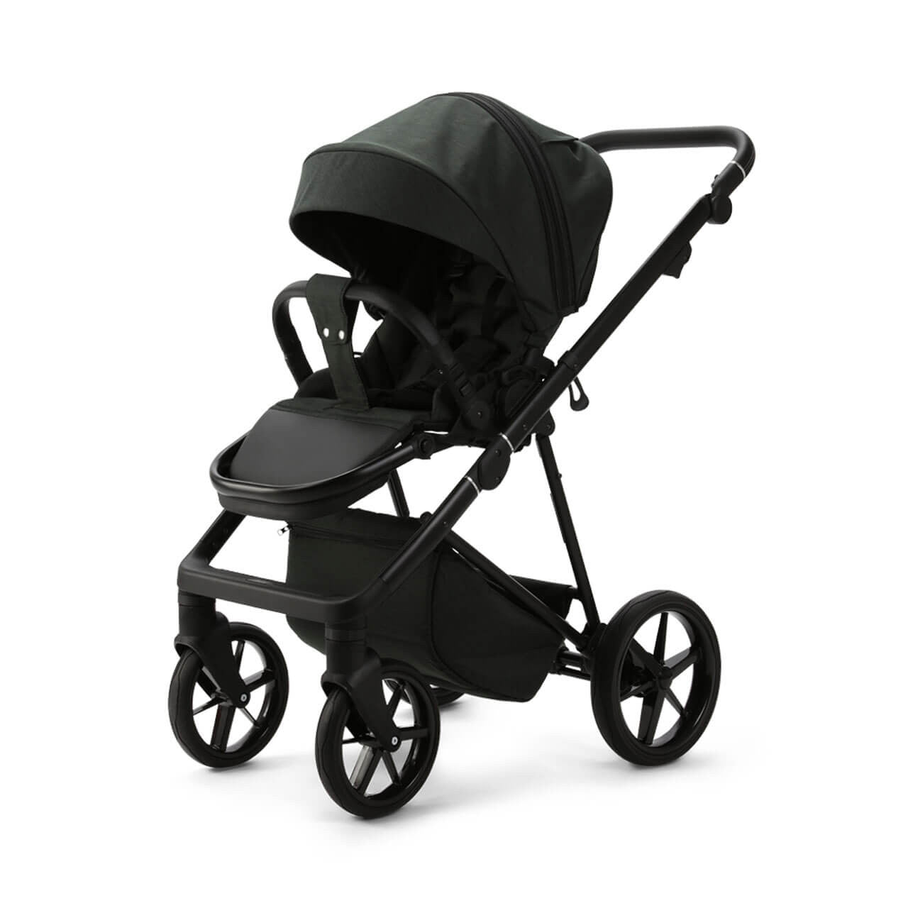 The Milano Evo chassis is equipped with wheels that are resistant to punctures, featuring soft shock absorbers. It also includes an integrated parking brake and a closed shopping basket. The easy-adjustable leatherette handlebar ensures a perfect fit for any parent..