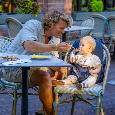 Besides its sleek and stylish design, it is the world's first backpack-to-baby seat solution. This means you do not need to worry about a highchair when you are out and about, the backpack attaches to any seat and it has a padded harness that you can attach so your baby sits comfortably. Also, the backpack conveniently hangs on strollers for easy access, making it perfect for busy parents on the go.