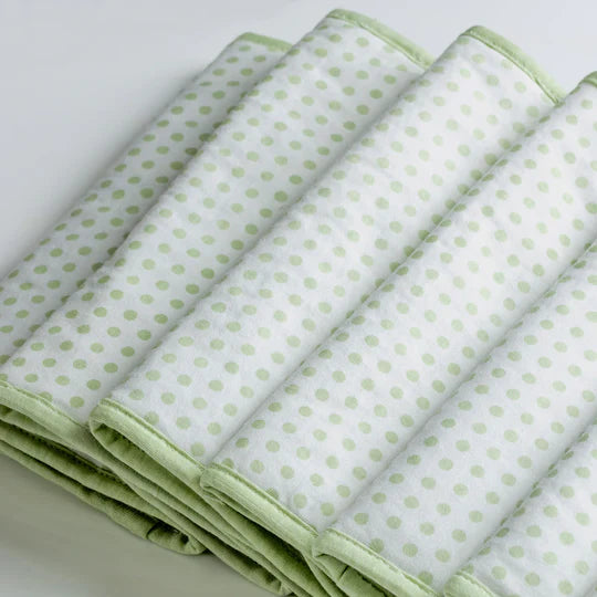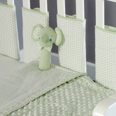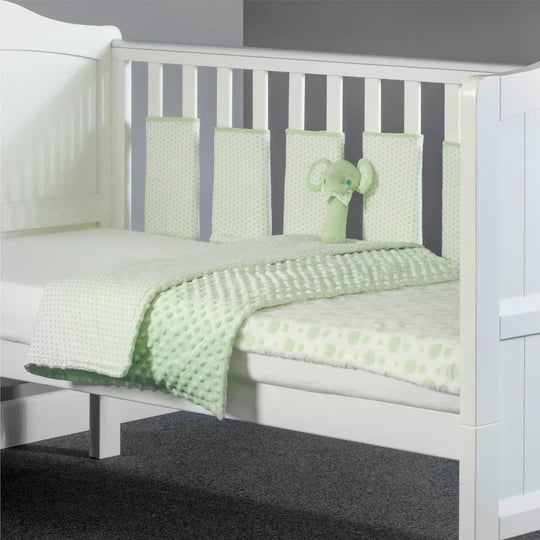 - Eight padded bumper pods that Velcro to the bars in your baby’s cot to keep baby’s head protected without the need for ties or strings. Sage green spots fabric with sage cotton trim.