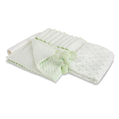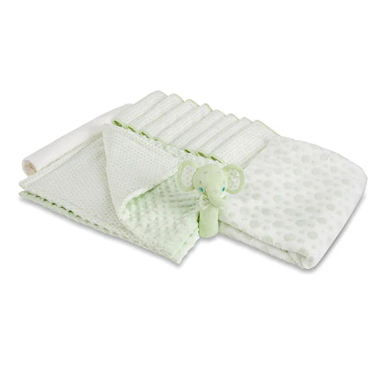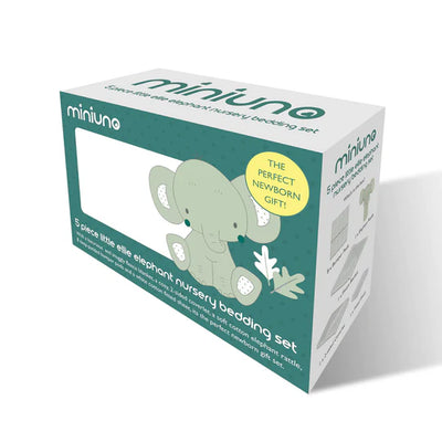 This beautiful infant bedding set is the perfect gift for any newborn baby. All the items are produced in high quality fabrics and finishes and feature the sage elephant spots design and a delightful elephant character. The five soft and sumptuous pieces are specially designed to keep baby comfortable and cosy whilst also looking stylish and modern in your baby’s nursery.
