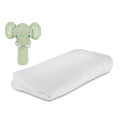 - Soft and cuddly elephant character rattle that is perfect for little hands and is finished in a lovely sage green cotton fabric with a gentle rattle sound.