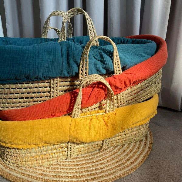 This artisan Moses basket is definitely a statement piece!  Crafted using luxuriously soft cotton fabric in rich colours; it’s evocative of the earthy-toned fabrics and spices that you’d encounter in the finest Marrakesh bazaar!
