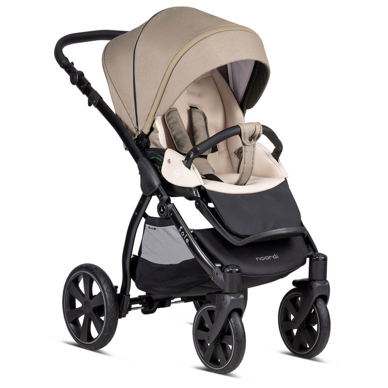 The Noordi Sole Go is compact folding pushchair inspired by the Norwegian way of life and offers optimal comfort for outdoor strolls. Durable aluminium chassis with Real-Gel™ wheels and adjustable shock absorption system ensures excellent ride on any terrain like forest trails, sand or snow. The One-Click™ braking system ensures the highest safety. The handlebar with luxe eco-leather grips can be adapted to match your height. Extra-large shopping bag allows you to put in your baby's essentials.