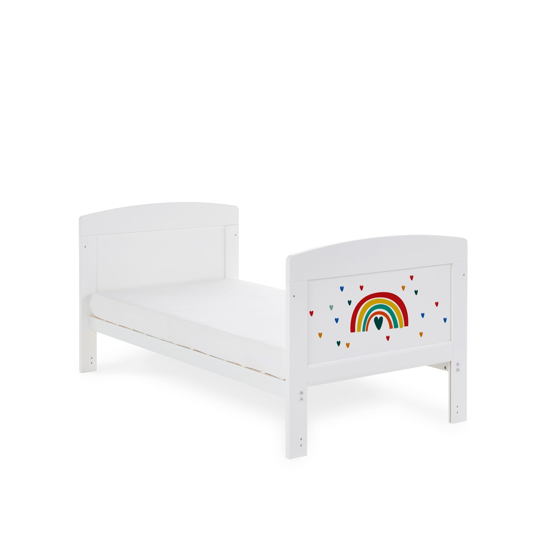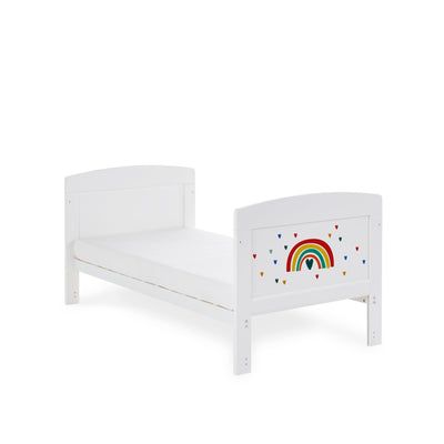 White Obaby Grace Inspire cot bed with rainbow and multicolour heart illustrations, adjustable base, convertible design for toddler use