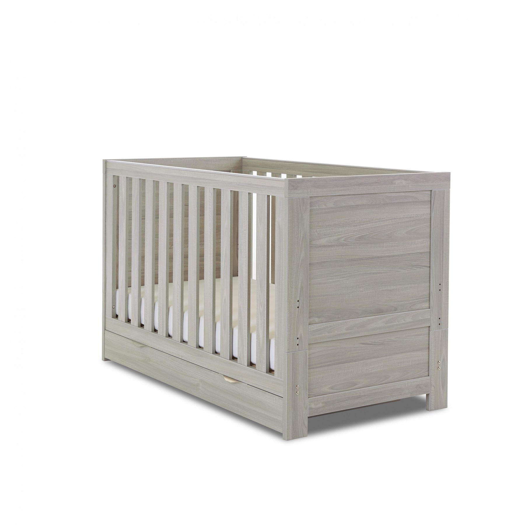 The Obaby Nika range offers a contemporary design, due to its clean lines and textured oak effect finish, that will fit perfectly in today’s modern nursery. This 2 piece room set consists of Nika cot bed and changing unit.