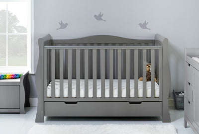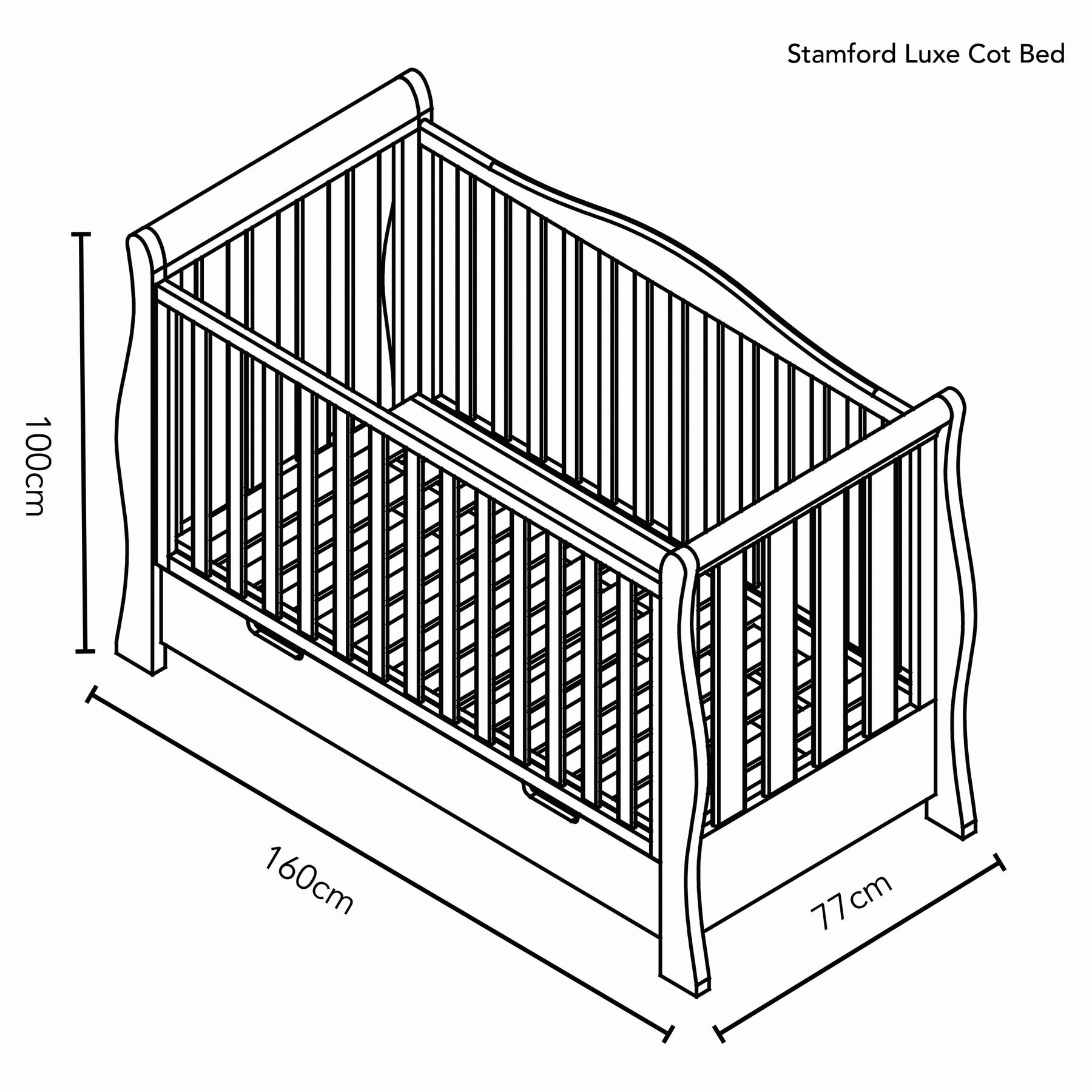 Standing proud at the top of the range is the beautiful Stamford Luxe sleigh cot bed. The Luxe cot bed can adapt to suit every stage of your little one’s early development. Starting as a cot, the Luxe features an adjustable mattress base that can be lowered as your baby learns to sit and stand, so that they are safe and secure at all times while the presence of a teething rail helps to protect their delicate first teeth. Once your child is old enough to progress, the Luxe can be transformed into a toddler bed, with or without safety rail, that is suitable to approximately four years old. And finally, when they outgrow this, the Luxe can become a useful day bed for lounging and relaxing. Requires an Obaby 140 x 70cm mattress. The integrated under drawer has a huge 77L capacity, smoothly glides on runners and fits neatly under the cot bed.