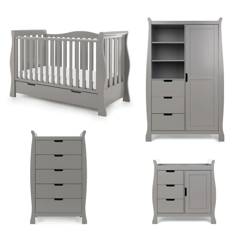The Obaby Stamford furniture range offers families the perfect combination of style, quality and practicality. The Stamford Luxe 4 piece room set consists of the beautiful Stamford Luxe cot bed with under drawer, closed changing unit, double wardrobe and tall chest of drawers. All pieces feature the same elegant sleigh design that flows throughout the Stamford range.