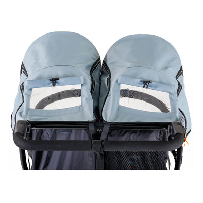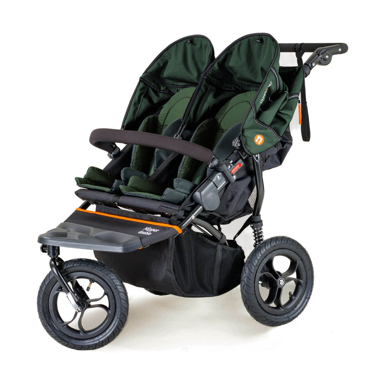 As well as the single version, the Out n About Nipper Double V5 can be recognised by improved technical water resistant and easy to clean fabrics available in multiple stylish colours, finished with new company logos and energetic orange accents. Its has been equipped of two multi-position, flat-reclining seats with liners, 5-point safety harnesses and full width bumper bar for sharing. The buggy features reliable one-hand folding mechanism with auto-lock, which effectively collapses this double stroller to a relatively compact, easy to handle and transport size.