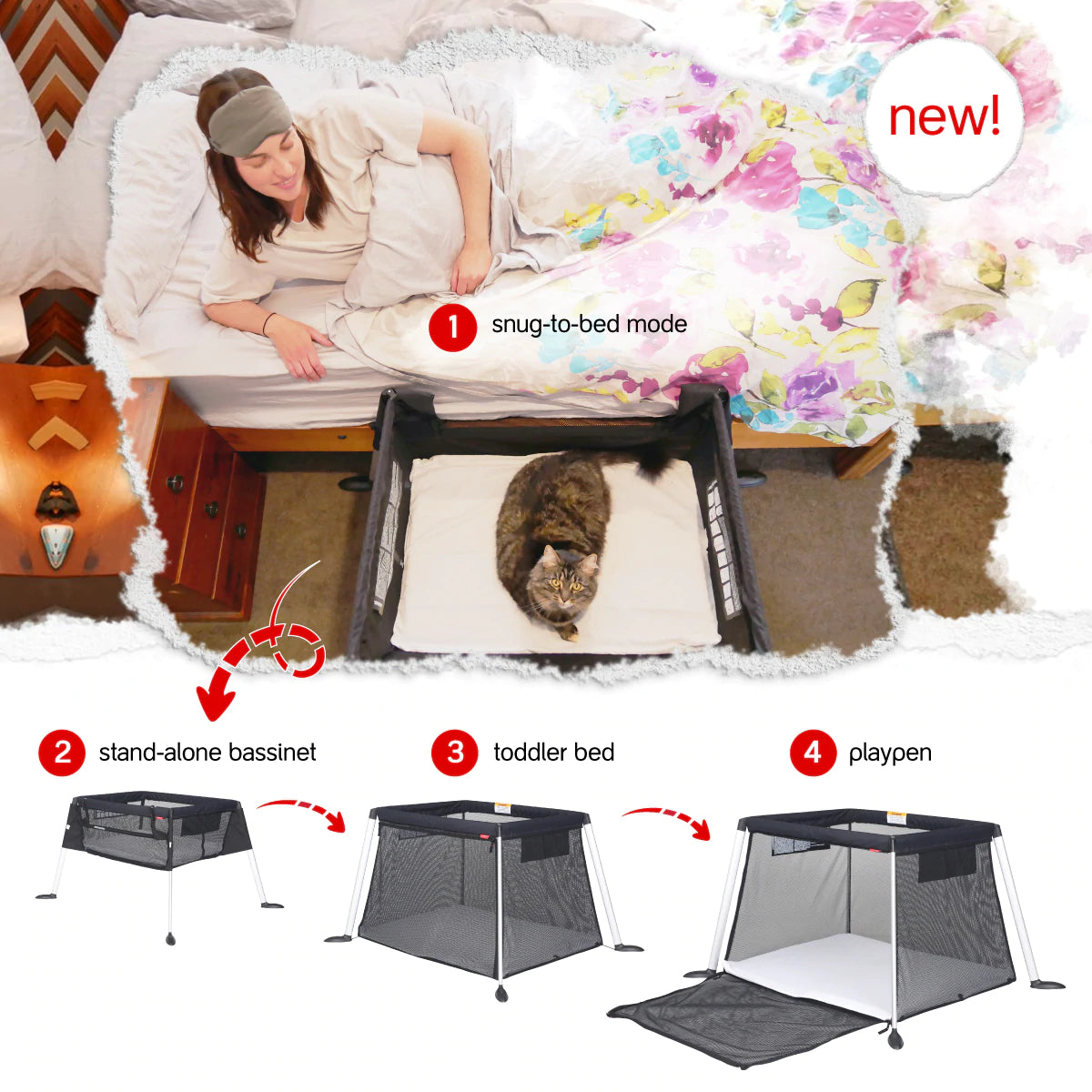 - Go from a newborn bed, portable bassinet, toddler bed or a fun playpen
