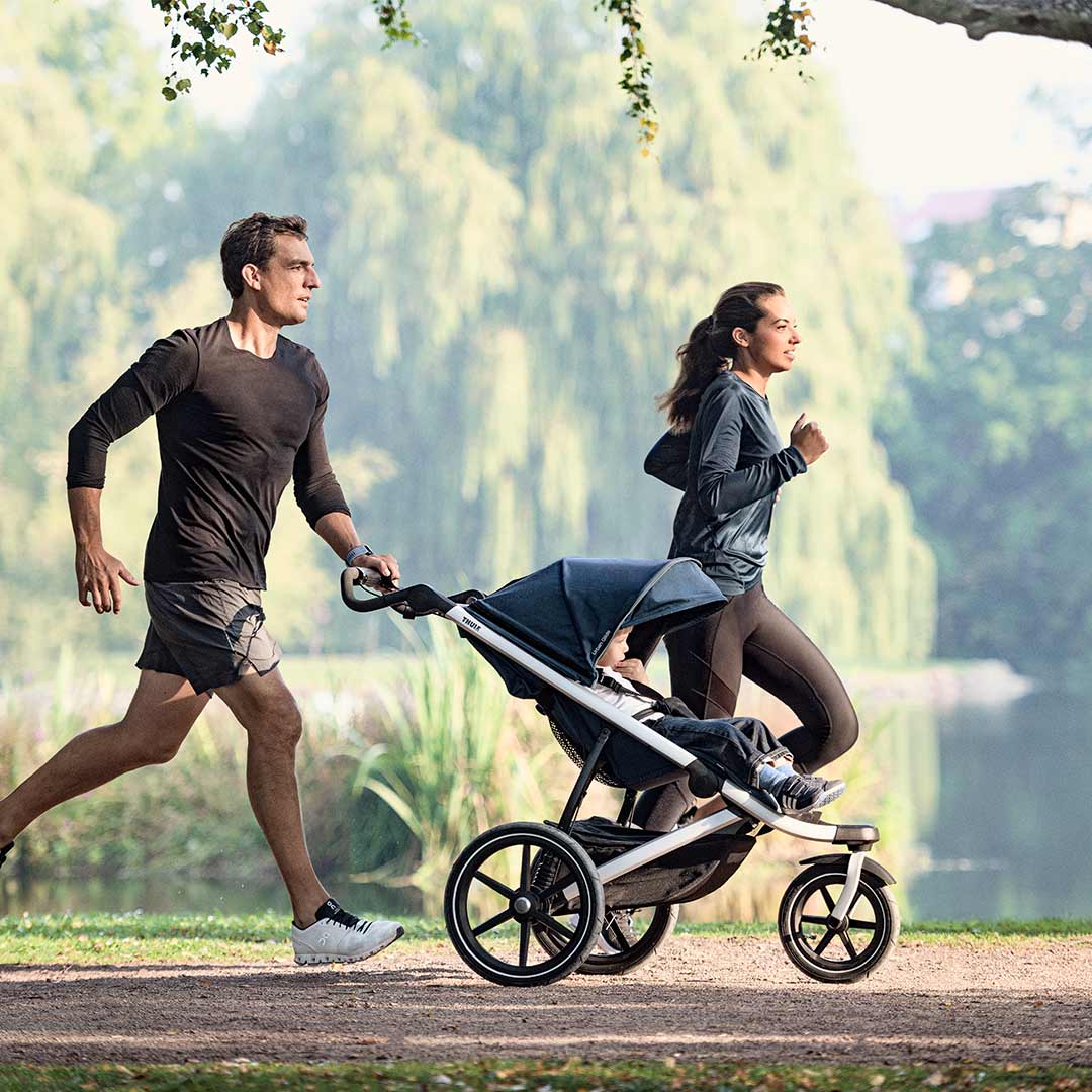 The design includes large 16” wheels, suspension for comfort and control, a swivel front wheel for strolling and manoeuvring around town that quickly and easily locks in place for jogging or rougher terrain.