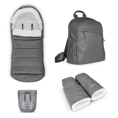 The UPPAbaby Accessory Pack are the ideal accessories to complement your stroller. This package consists of a backpack, handmuffs, footmuff and cup holder.